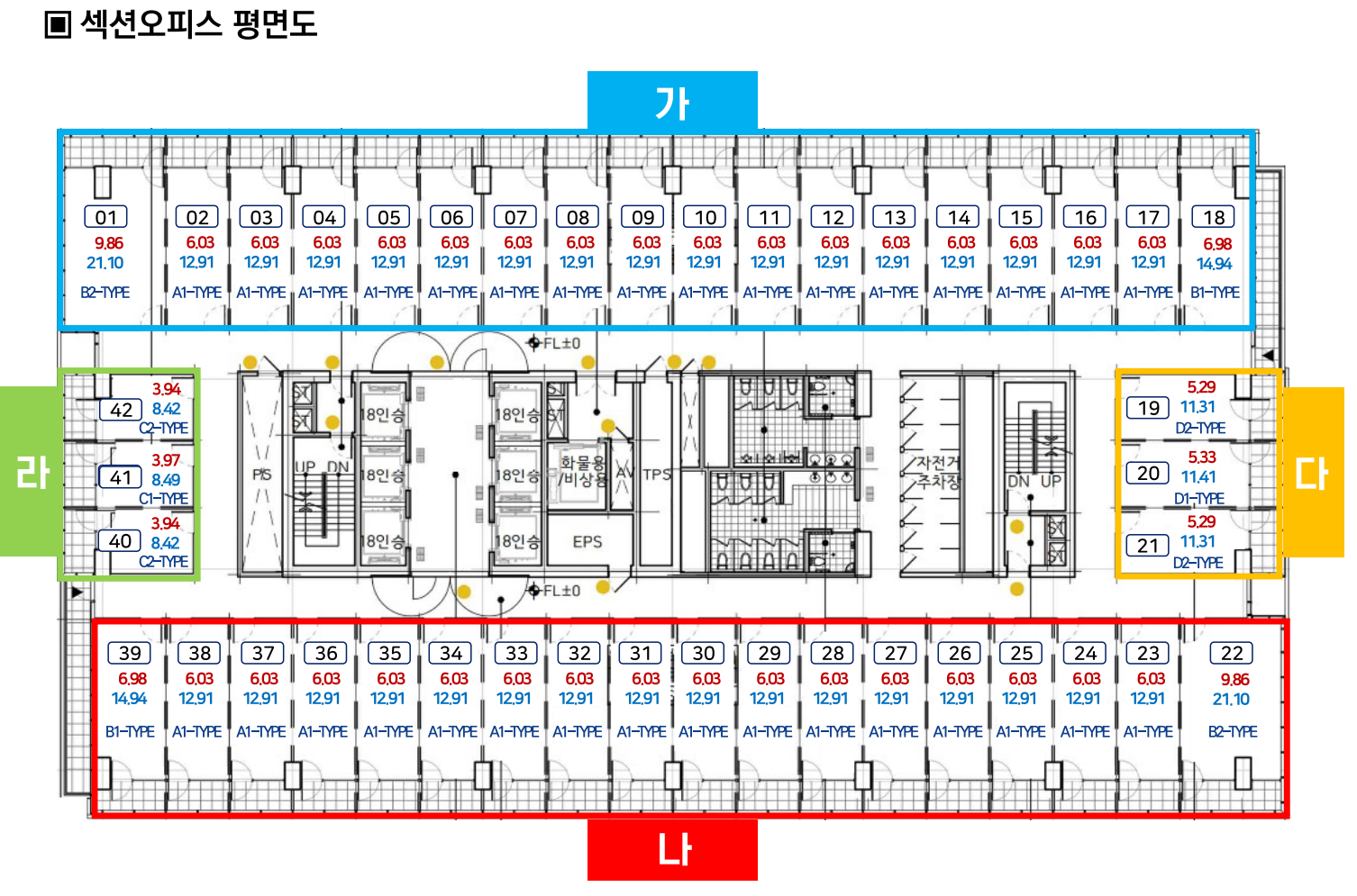아래는 각 층별 섹션오피스(그냥 소형 오피라고 부르면 될 것을...) 평면도입니다.